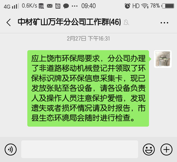 萬(wàn)年分公司現(xiàn)有28臺(tái)套設(shè)備需要登記取證,經(jīng)過(guò)管理人員不懈努力,采集工作順利完成,經(jīng)市、縣環(huán)保部門(mén)的審核,分公司于2020年2月在萬(wàn)年縣生態(tài)環(huán)境局領(lǐng)取非道路移動(dòng)機(jī)械環(huán)保信息標(biāo)示牌及環(huán)保信息采集卡。